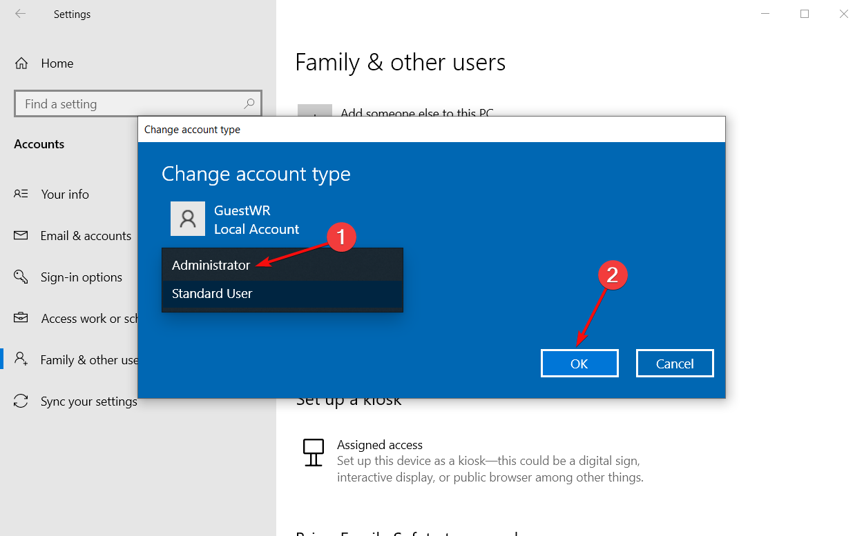 - Choisissez Administrateur dans le menu déroulant et cliquez sur OK.