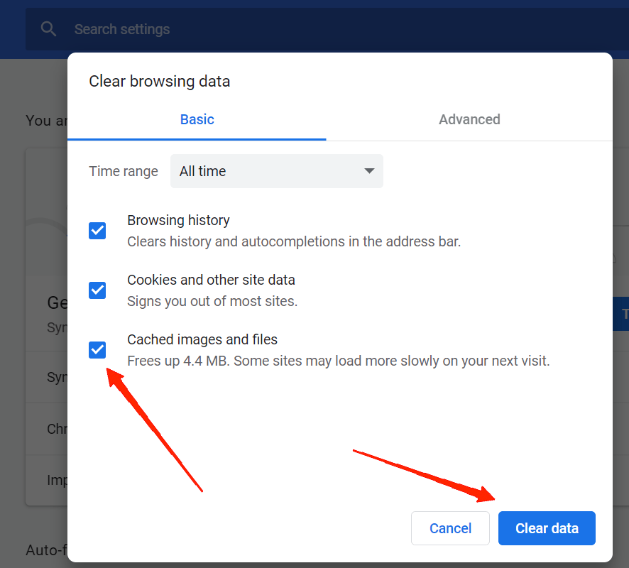 - Chrome / Edge / Firefox の履歴メニューから「閲覧履歴データの削除」を選び、キャッシュされた画像とファイルをクリアします。