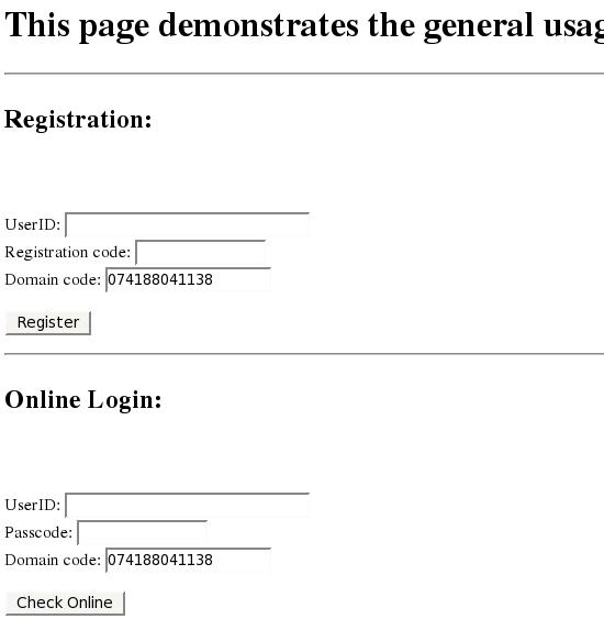 Online Login 섹션의 Username 상자에 방금 등록한 사용자 이름을 입력합니다. 토큰 클라이언트에서 생성한 원타임 패스코드를 Passcode 상자에 입력하고 Check Online 버튼을 클릭합니다. 인증이 성공하면 다음 페이지 상단에 Success가 표시됩니다.