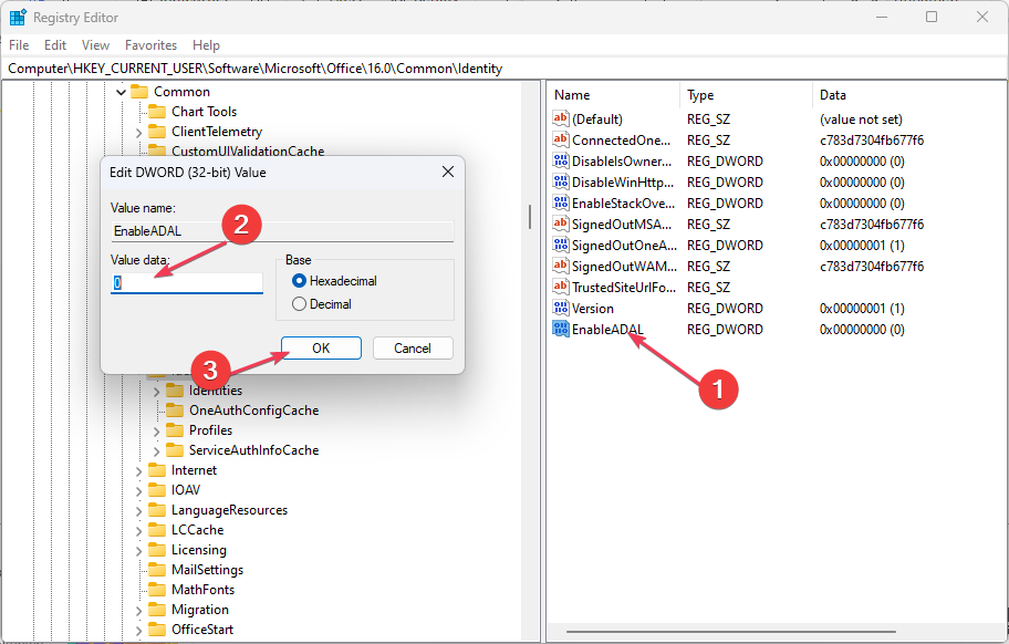 - Дважды щёлкните EnableADAL, установите Base — Hexadecimal, Value data — 0, затем OK.