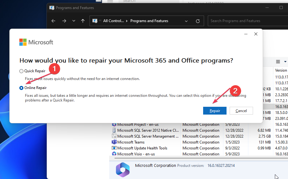 Ремонт через интернет восстанавливает повреждённые файлы и обновляет компоненты Office.