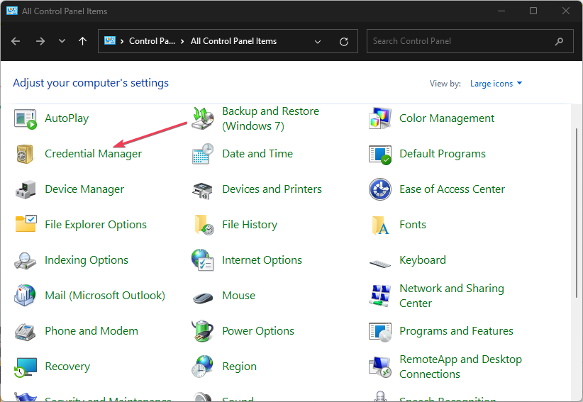 - В списке «Просмотр» выберите «Крупные значки», затем откройте Credential Manager (Диспетчер учётных данных).