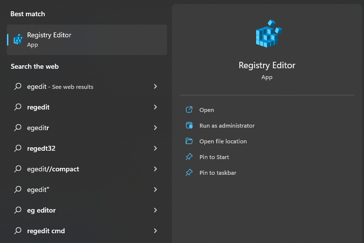 - Нажмите Пуск, введите regedit и откройте Редактор реестра.