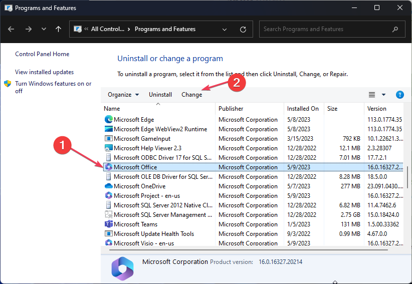 - Найдите Microsoft 365, щёлкните правой кнопкой и выберите Change.