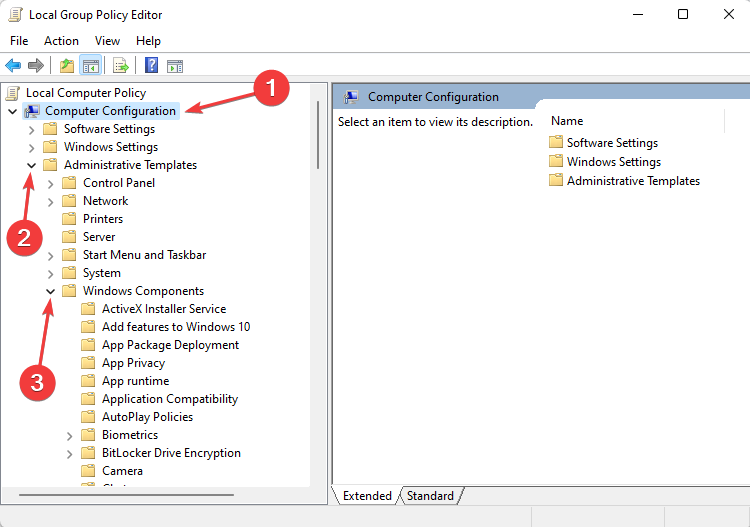- Перейдите: Computer Configuration → Administrative Templates → Windows Components.