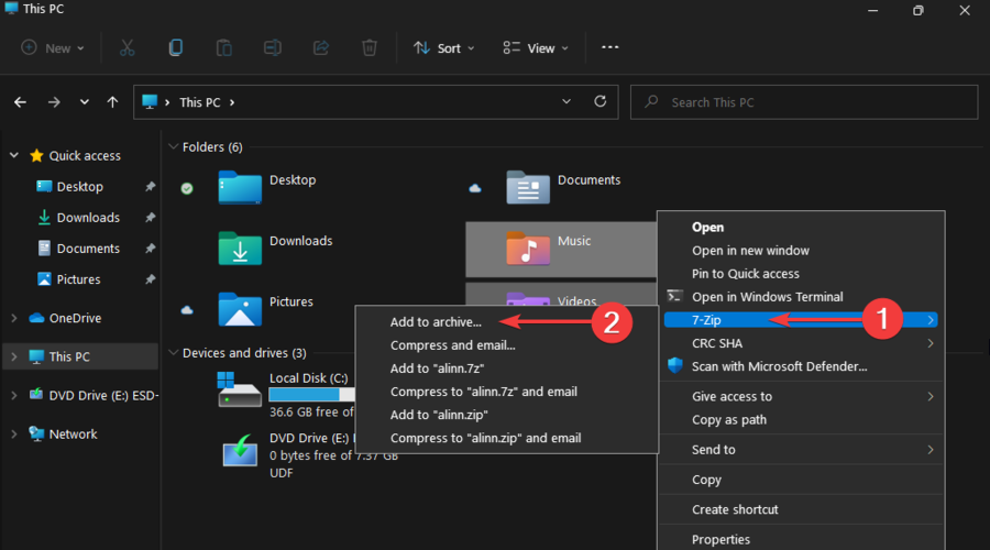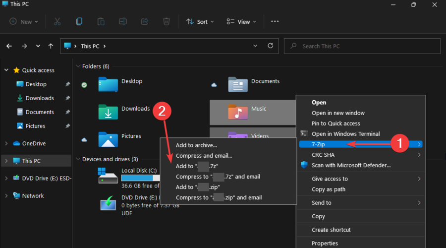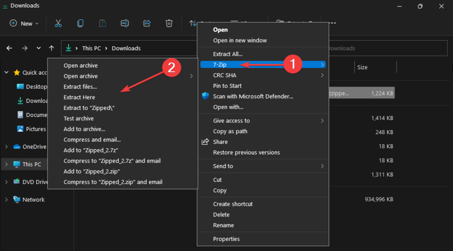 - Наведите на пункт 7-Zip и выберите «Add to filename.zip» или «Add to filename.7z» для быстрого архива.