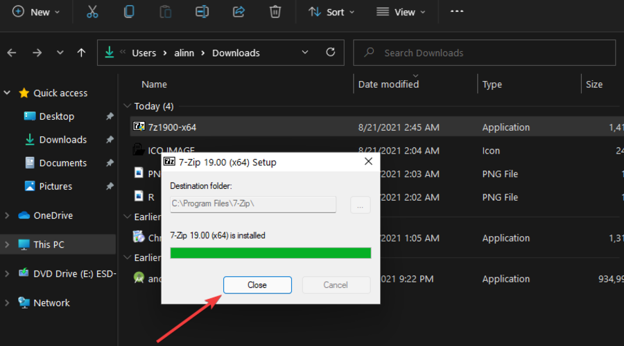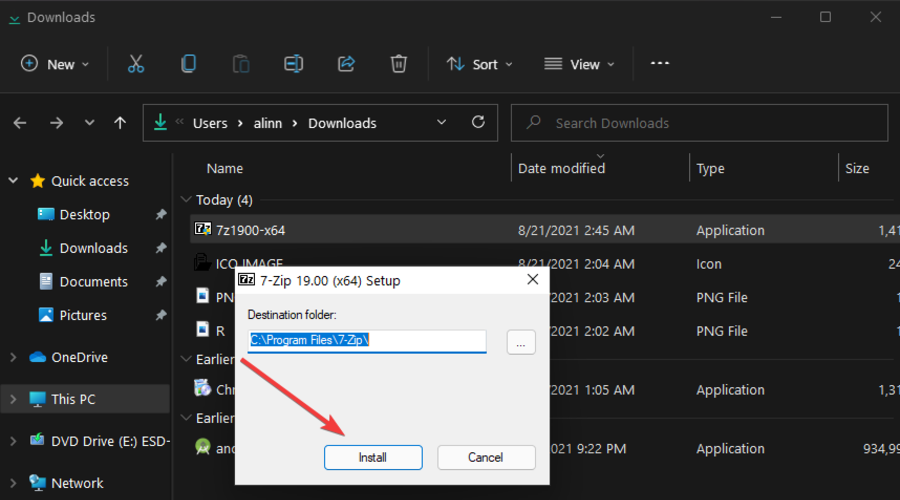 - Перейдите в папку, куда скачали установщик 7-Zip, и дважды кликните по файлу установки.