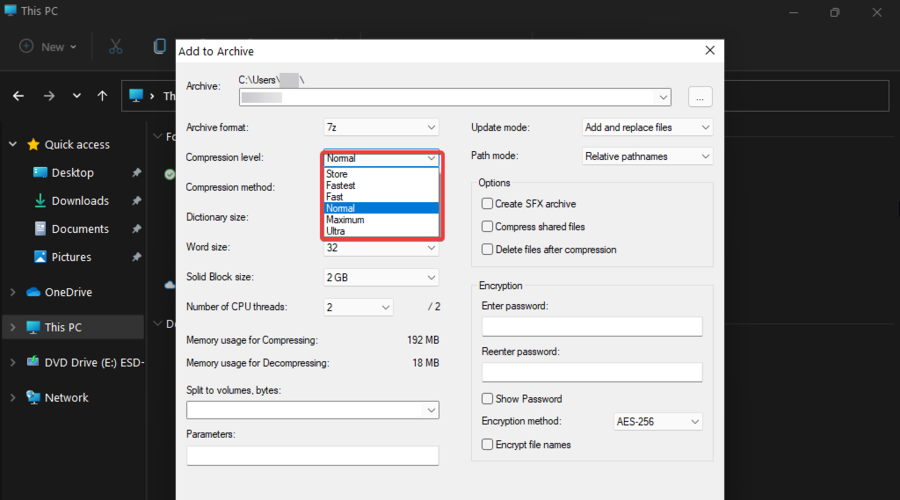 - Уровень сжатия: Store (быстро, без сжатия), Fastest, Fast, Normal (по умолчанию), Maximum, Ultra (наиболее медленно, максимальная экономия места);