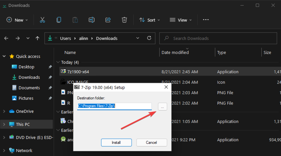 - В окне установки 7-Zip при желании нажмите на три горизонтальные точки, чтобы выбрать папку установки.