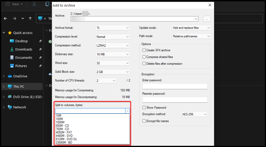 - Split to volumes — разбиение архива на части фиксированного размера.