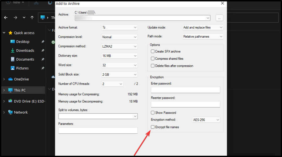 - Для формата 7z можно также отметить Encrypt file names, чтобы скрыть имена файлов внутри архива.