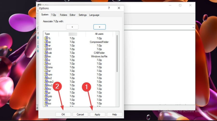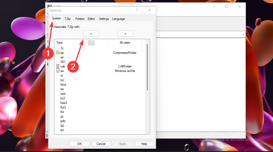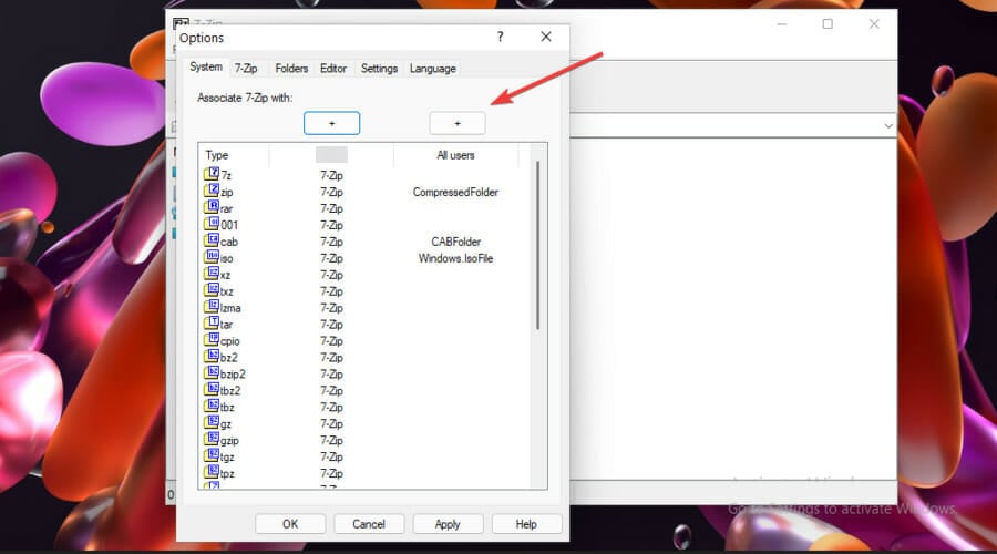 - Нажмите второй + для выбора расширений, которые хотите назначить 7-Zip по умолчанию.