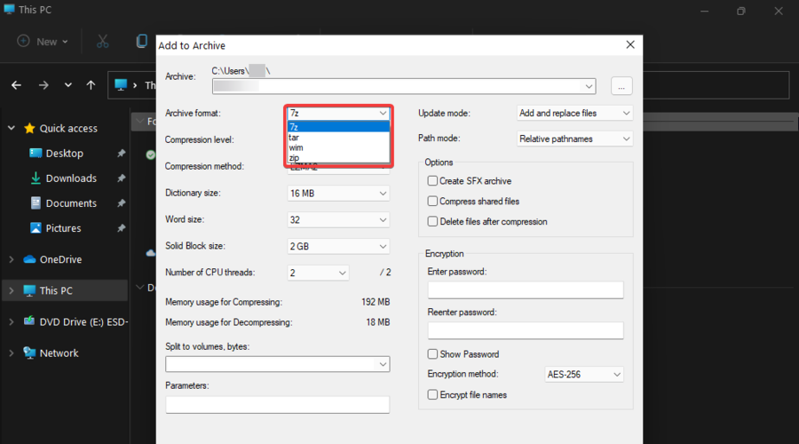 - Выберите формат архива 7z или zip — оба поддерживают шифрование паролем.