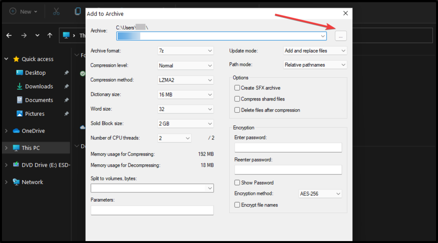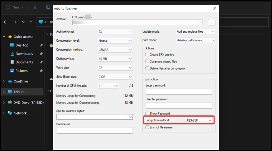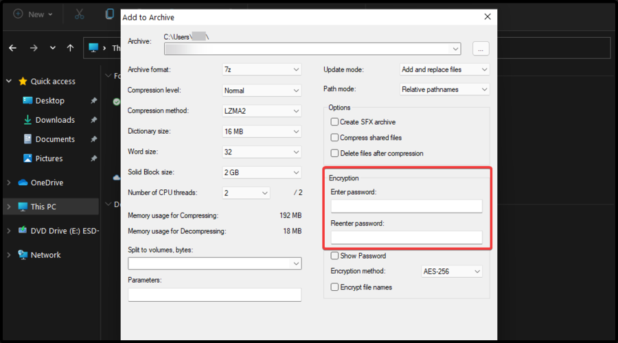 - При создании архива выбрать Password и AES-256, если данные чувствительные.
