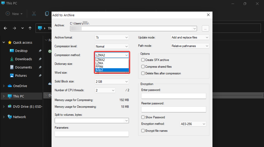 - Метод компрессии (например, LZMA, LZMA2 и другие);
