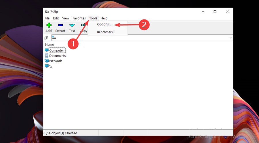 В окне 7-Zip выберите меню «Tools», затем «Options».