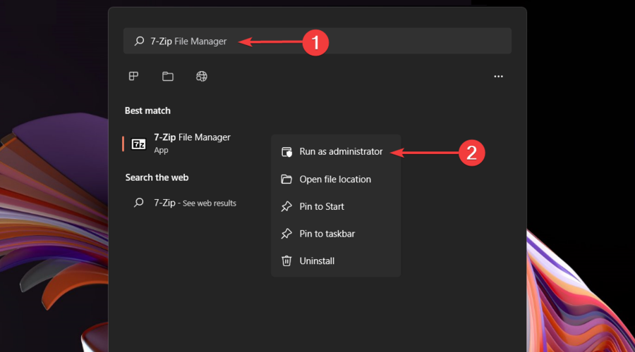 - Нажмите клавишу Windows, найдите 7-Zip File Manager, щёлкните правой кнопкой и выберите «Запуск от имени администратора».