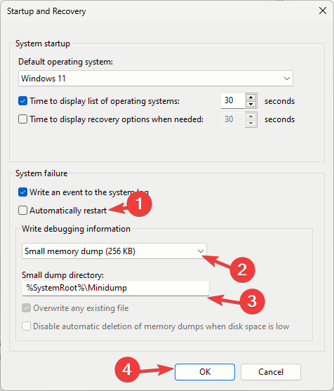 Снимите галочку с “Выполнять автоматическую перезагрузку”; в разделе “Запись отладочной информации” выберите “Небольшой дамп памяти (256 КБ)” и установите каталог