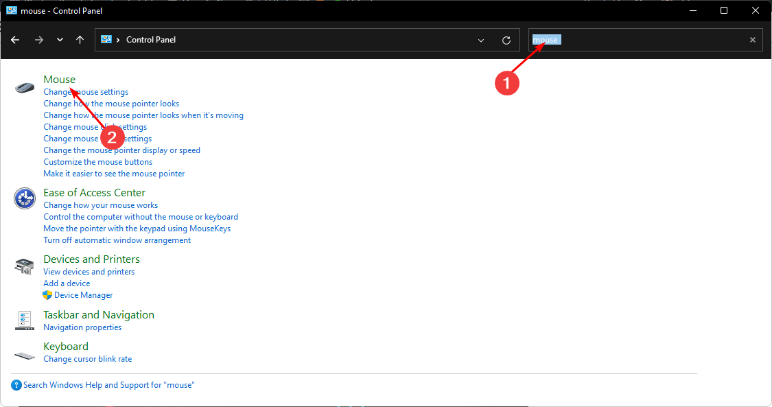 - В строке поиска Панели введите «Мышь» и откройте соответствующий раздел.