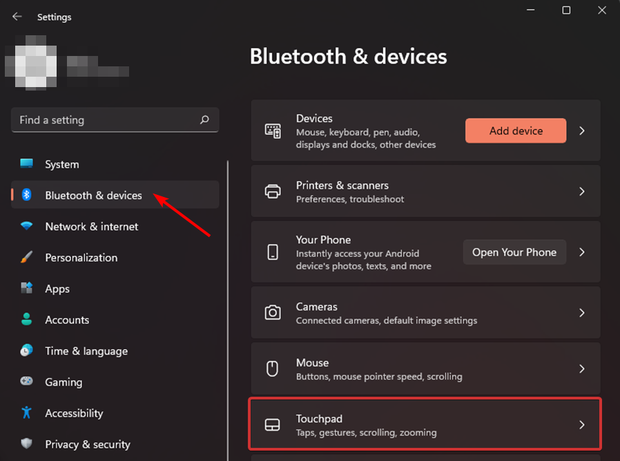 - Выберите «Bluetooth и устройства» в левой колонке, затем «Тачпад» справа.