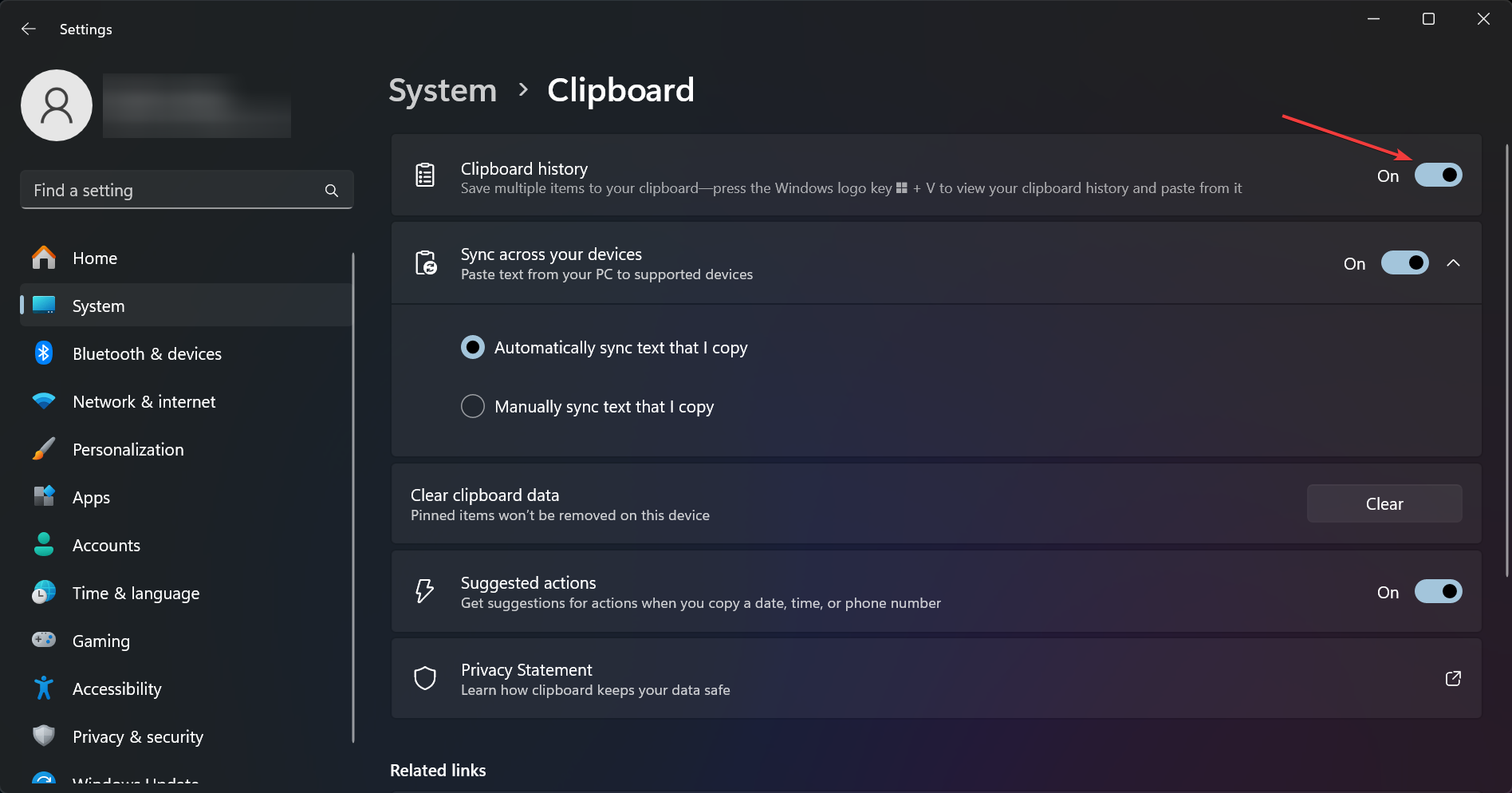 - Включите «Журнал буфера обмена» в Параметры → Система → Буфер обмена.