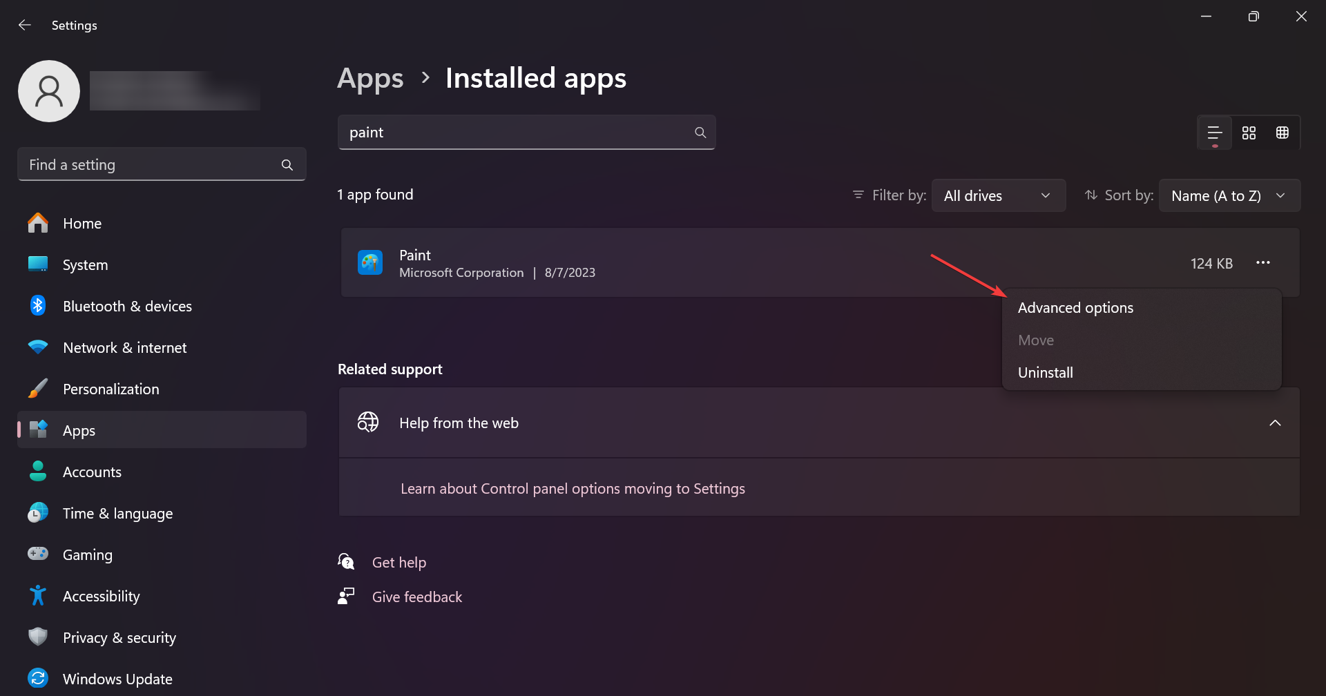 - Найдите Paint, нажмите на три точки справа и выберите «Дополнительные параметры».