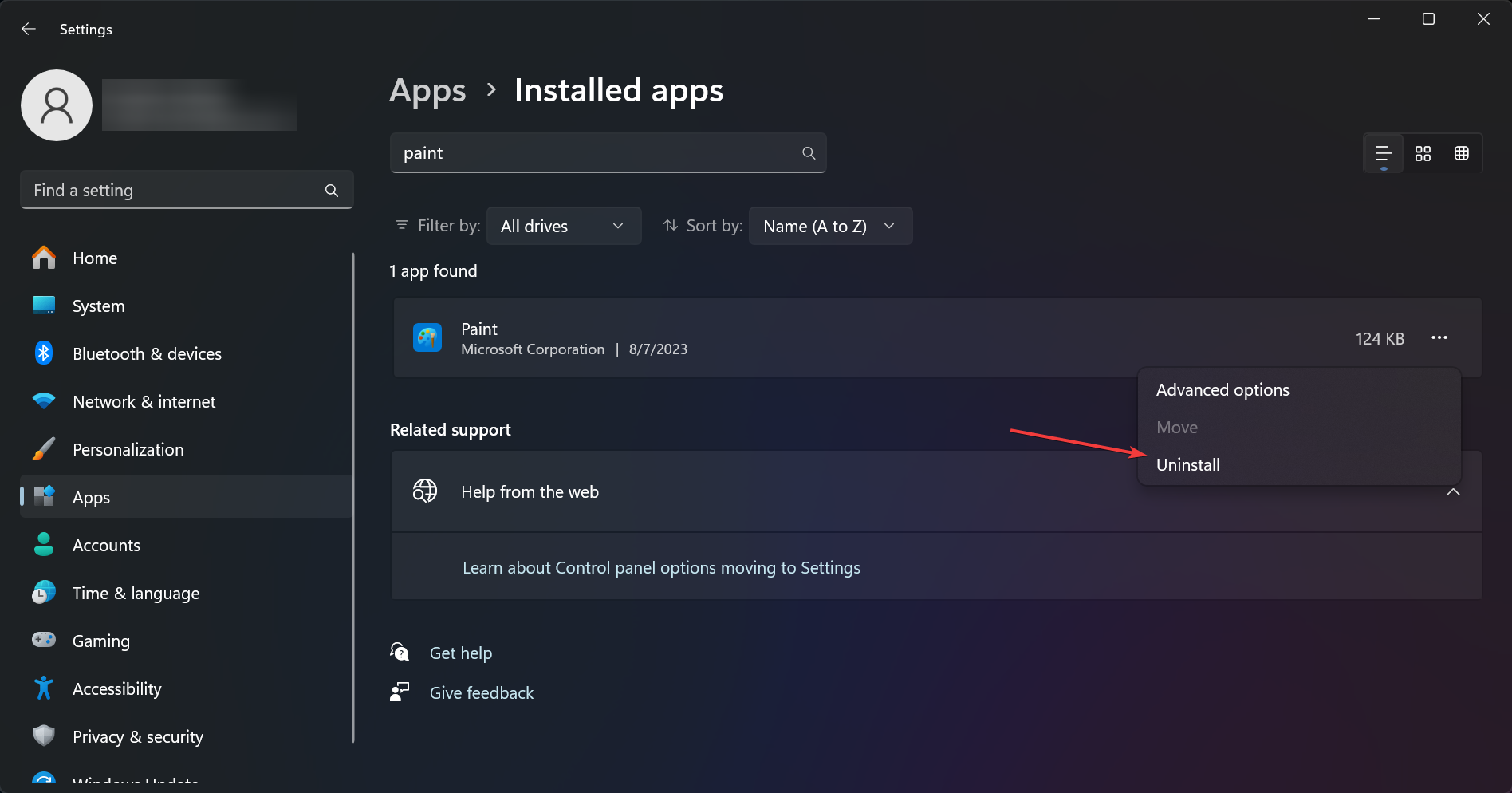 - Найдите Paint, нажмите три точки и выберите «Удалить».