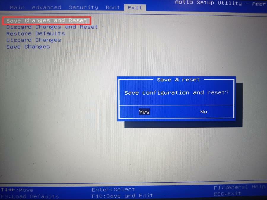 - Перейдите в меню «Exit» и выберите «Save Changes and Reset».
