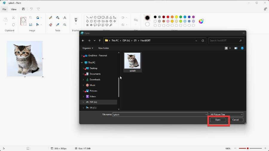 - В Paint через «Файл» → «Открыть» выберите «Этот компьютер», затем раздел ESP (A:), папку EFI и папку HackBGRT.