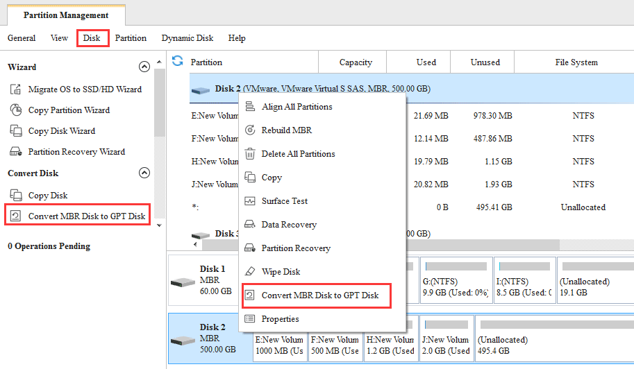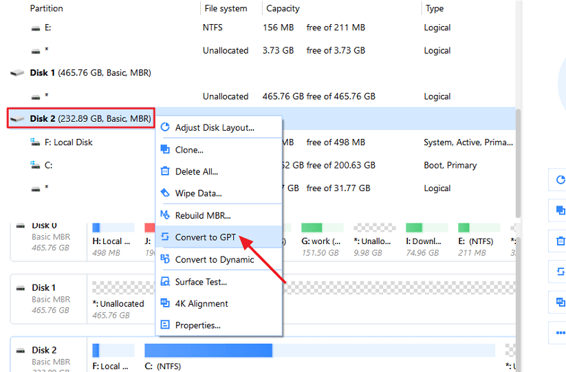 - Выберите диск и опцию Convert MBR Disk to GPT Disk.