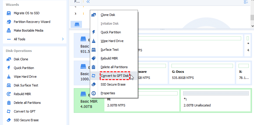 - Запустите программу, правой кнопкой кликните по тому диску и выберите Convert to GPT.