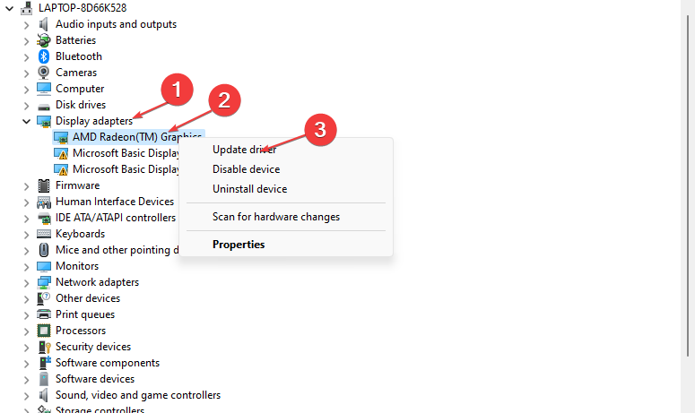 - Разверните раздел Видеоадаптеры, кликните правой кнопкой на графическом адаптере и выберите Обновить драйвер.