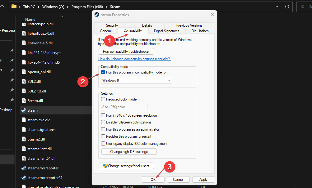 - Вкладка «Совместимость»: если включён флажок для режима совместимости — снимите его.