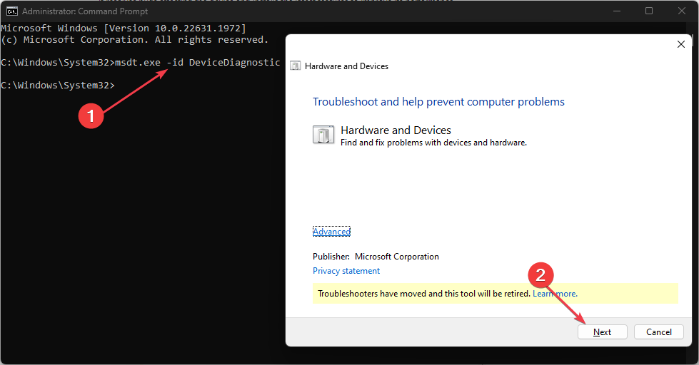 - Введите и выполните команду для запуска средства устранения неполадок «Оборудование и устройства»:
