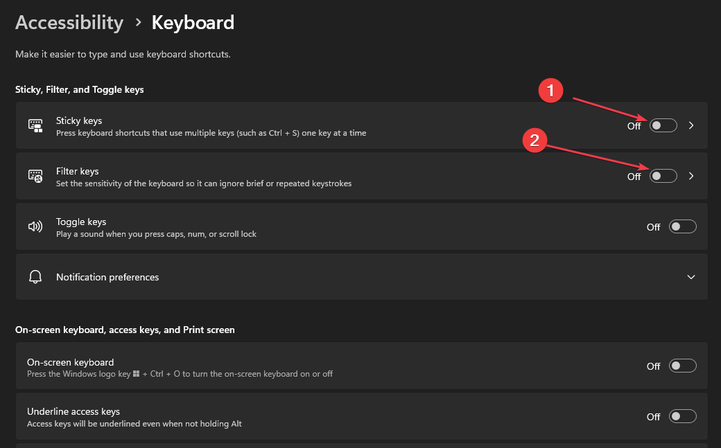 - Отключите «Фильтрацию» клавиш (Filter Keys).