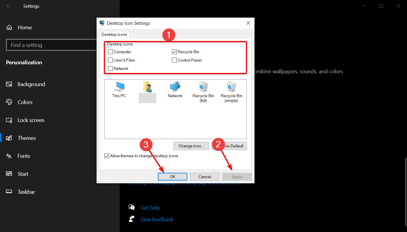 - По желанию снимите галочку «Разрешить темам изменять значки рабочего стола», чтобы темы не меняли вид значков.