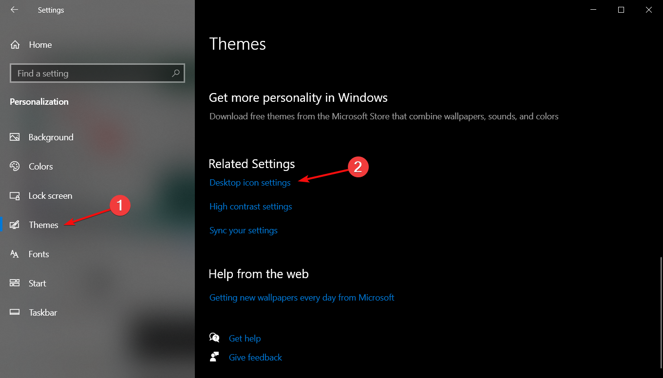 - Выберите «Темы» в левой колонке, прокрутите вправо и нажмите «Параметры значков рабочего стола».