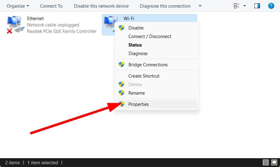 - Кликните правой кнопкой по используемому сетевому подключению и выберите «Свойства».