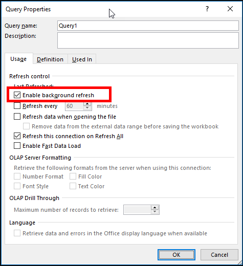 - В окне Свойства запроса в разделе управления обновлением снимите галочку с Разрешить фоновые обновления.