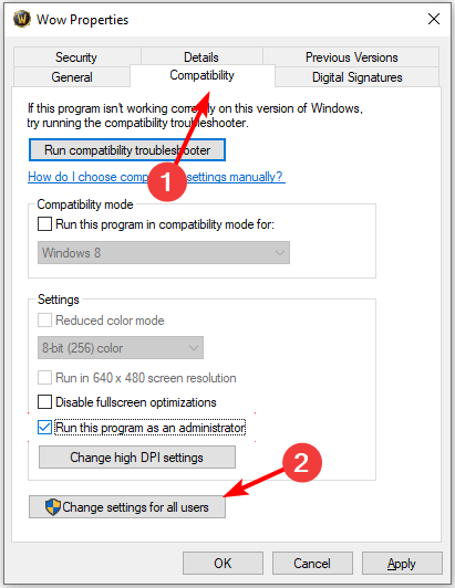 - Во вкладке Совместимость нажмите «Изменить параметры для всех пользователей».