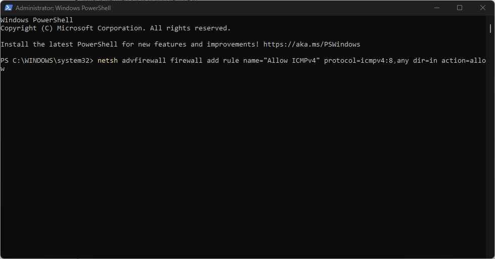 netsh advfirewall firewall add rule name="ICMP Allow incoming V4 echo request" protocol=icmpv4:8,any dir=in action=allow- Закройте окно и перезагрузите ПК (при необходимости).