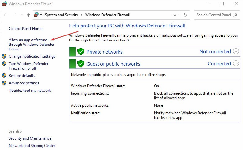 - Нажмите «Разрешить приложение или компонент через брандмауэр Windows Defender».