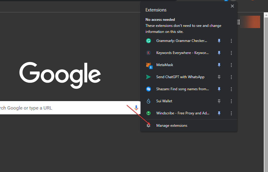 - Нажмите на иконку «Расширения» рядом с адресной строкой и выберите «Управление расширениями».