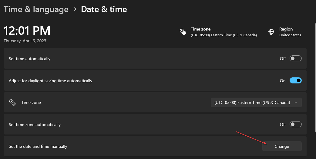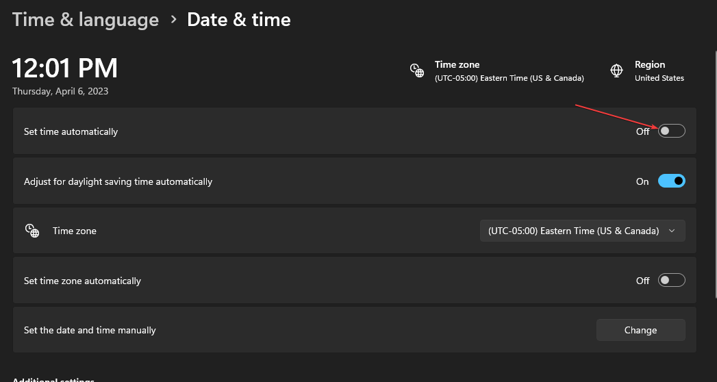 - Отключите «Установить время автоматически», затем вручную установите правильную дату и время и нажмите «Изменить».