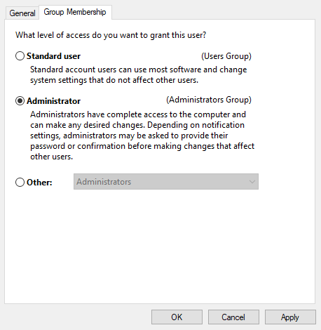 ALТ: Вкладка Членство в группах с опцией «Администратор»