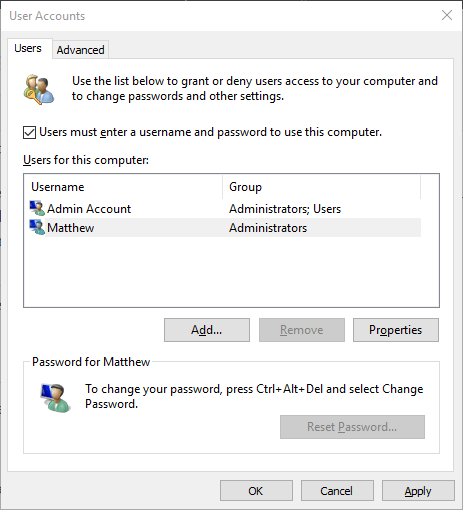ALТ: Окно netplwiz — управление локальными учётными записями Windows