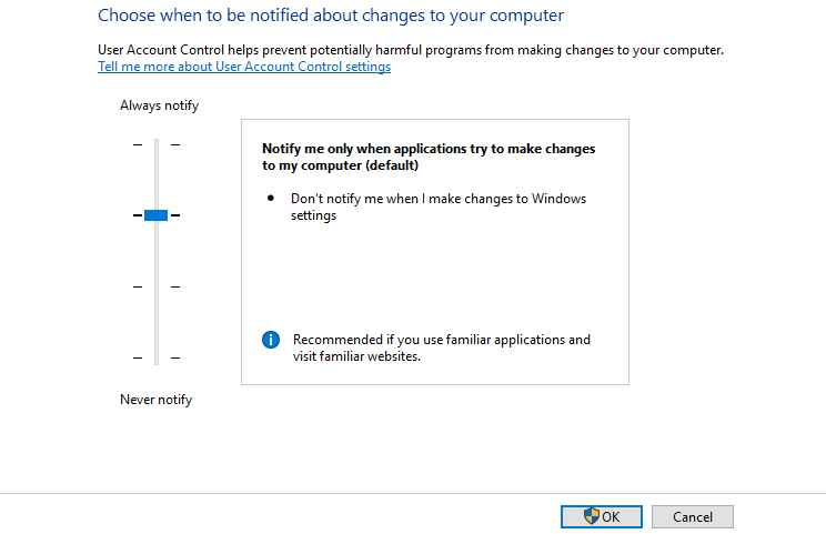 - Проверьте настройки UAC и при необходимости временно снизьте уровень уведомлений.