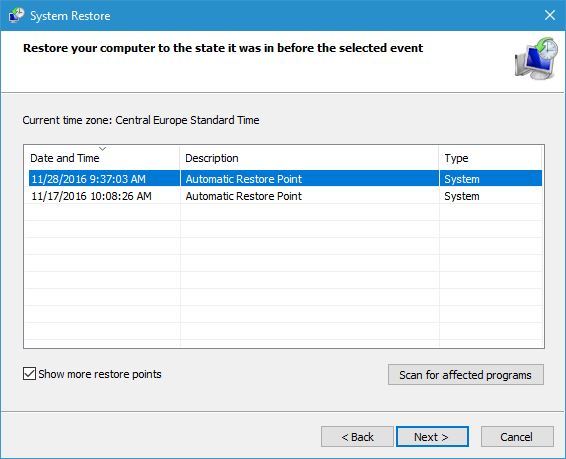 - Далее → Показать дополнительные точки восстановления → выберите дату до появления ошибки.