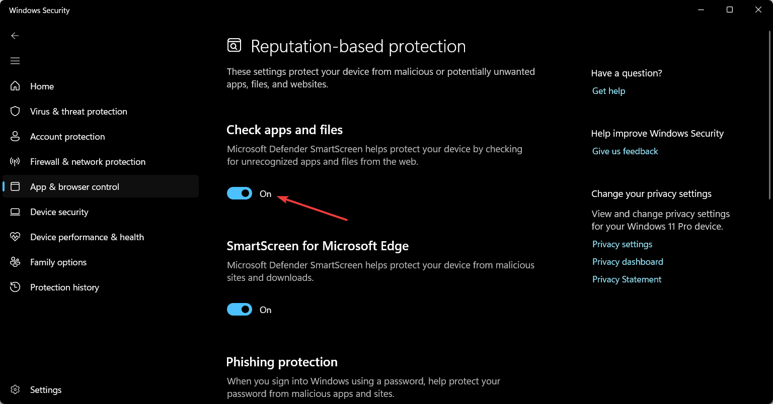 2. Изменить параметры «Проверка приложений и файлов» в Windows Security