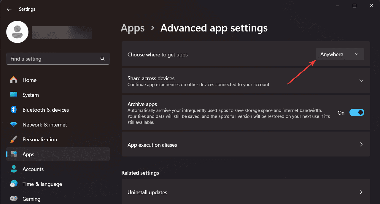- Найдите настройку Выбор места получения приложений, разверните выпадающий список и выберите опцию Откуда угодно.